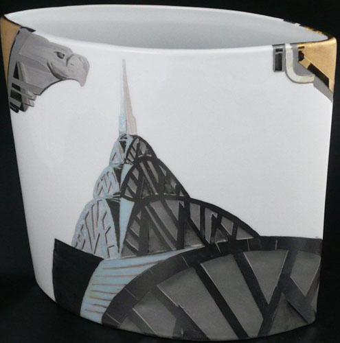 Top of the Chrysler Building in New York. Deep sandblasting in recessed areas. Painted with platinum. gold and other lusters.