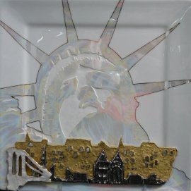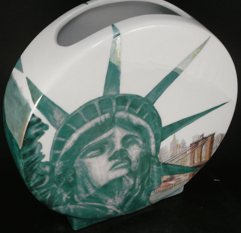 This piece has sand blasting on Liberty's face, and is painted with lustre. the added pieces are handmade from porcelain clay, to represent the cityscape and the Brooklyn Bridge.