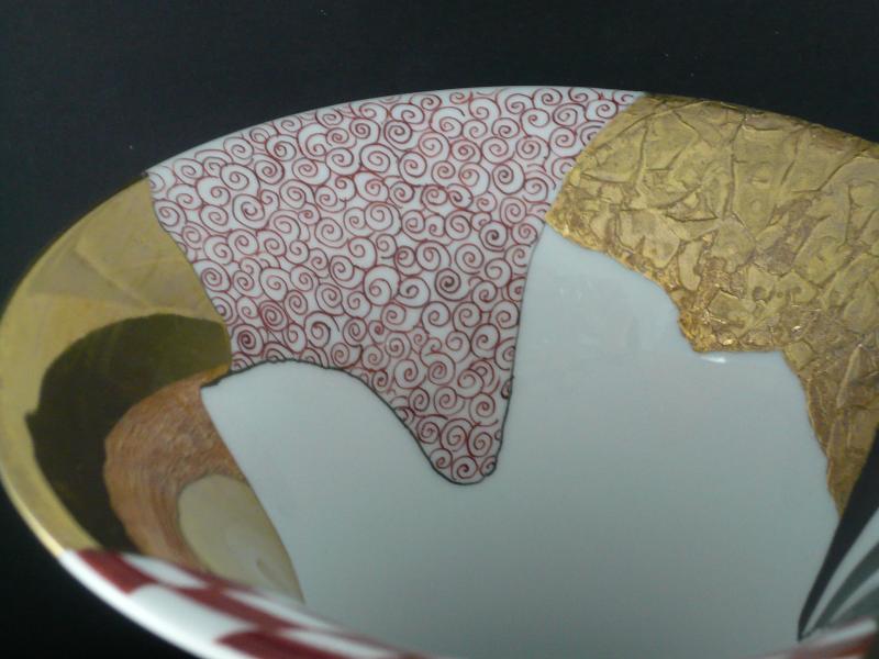 The black wrought iron design bordering this scene is blasted for depth. it is actually engraved deeply into the porcelain bisque (unglazed). I painted it with matte black so it would remain dull, in contrast to the sheen of the rest of the piece.