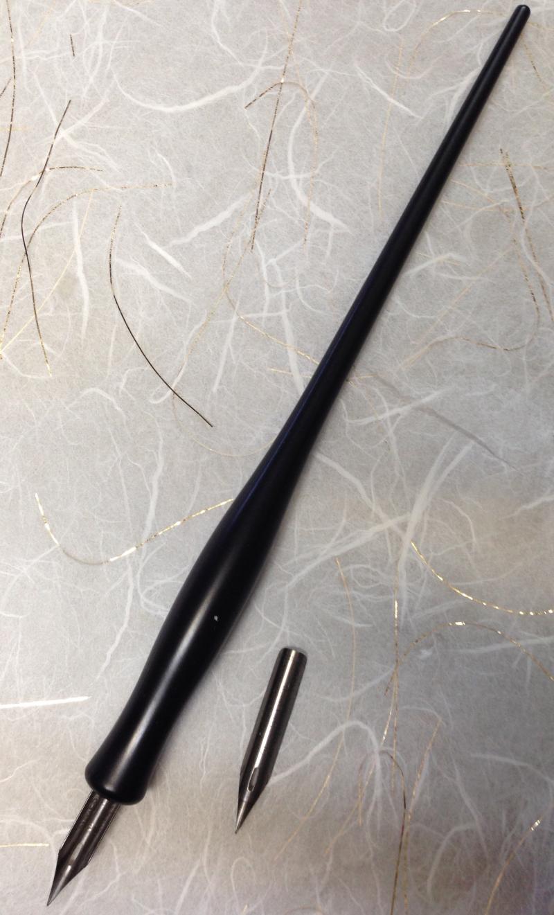 Mary uses pen nibs made from Pre-War steel. The last time they were manufactured was 1927. These nibs are very stiff, and do not split as readily as the popular nibs made today. It is an open ended nib, not a small cylinder that can become clogged with paint and oils. It fits a standard "Speedball" type of holder. Mary sells these nibs for $6.00 each and if you need a holder it is $3.00. Because the steel is so strong, the nib writes very nicely for a very long time. When it does wear down a bit, Mary puts the nib in a box with others that have worn down and uses those for any calligraphy (lettering) she needs to do.